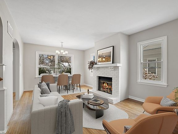 THERE'S NO PLACE LIKE HOME. This solidly built house enchants the moment you step through the door into a combination dining/sitting room with a brick fireplace adding that extra bit of magic. Hardwood floors throughout. The primary bedroom has two closets and fits a king bed easily. A graceful stairway leads to a light-flooded second bedroom or possible office space. A built-in nook and skylights make this room a delightful place to spend time. Step down into a large family room with a tray ceiling and plenty of room for big gatherings. Sliding glass doors lead to a brick patio with built-in brick fireplace and a large fenced in yard, extending your living space much of the year. The kitchen is cheerful and efficient and the basement already has wall studs, ready for finishing. Attached two car garage has two separate one car doors. Fresh neutral paint makes this appealing home move-in ready!!