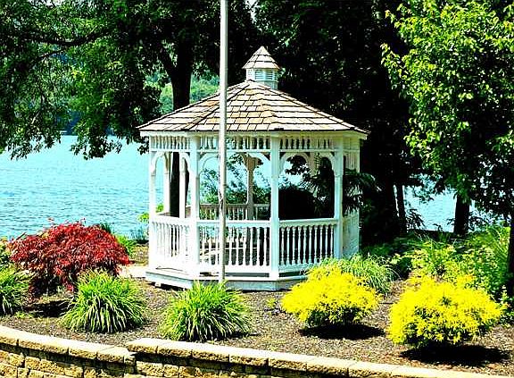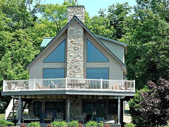 Beautiful contemporary home features cathedral ceilings and hardwood floors throughout, great room which overlooks the lake, features a floor to ceiling stone FP, and is open to the kitchen and dining area. Two bedrooms and a full bath with shower/tub combo. Balcony with sitting area overlooks great room, and lake through the chalet style windows. Private master located on second floor and features a master bath with corner Jacuzzi tub and shower. Finished Walkout Basement w/bar, family room bedroom & bath. 117' of pristine waterfront. Outstanding waterfront amenities. Large Permanent dock!