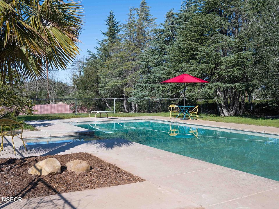 A sweet slice of heaven in the Santa Ynez Valley! Located in coveted Janin Acres on a 1 acre parcel, this single level home with pool is whispering your name! Redwoods and oaks frame the driveway laid with beautiful pavers which then meander along a path lined with native California plants to the inviting front entrance. Inside, warmth and light stream in through large windows to fill the living areas that blend together with a comfortable flow and gorgeous wood floors. The kitchen features black granite counters, stainless appliances, recessed lights, lovely cabinetry and bar seating at the peninsula. Romantic fireside dining flows from the kitchen and is open to the living room which features a large bay window, the perfect place to curl up with a favorite book. There are 3 light filled bedrooms, 2 baths that offer stone floors and solid stone surrounding the bathing areas. The primary bath even has an amazing rain shower! Smart upgrades such as CAT6 wiring, high efficiency LED lighting, tankless water heater, reverse osmosis, and solar panels make this a home to carry you into the future. The drought friendly yard is partially fenced with eco friendly composite fencing and highlighted by an inviting swimming pool which is sure to make a splash with your family and friends. Come enjoy the good life in the bucolic Santa Ynez Valley with world class wine tasting, notable dining, bakeries, coffee shops, boutiques and hiking/biking trails.
