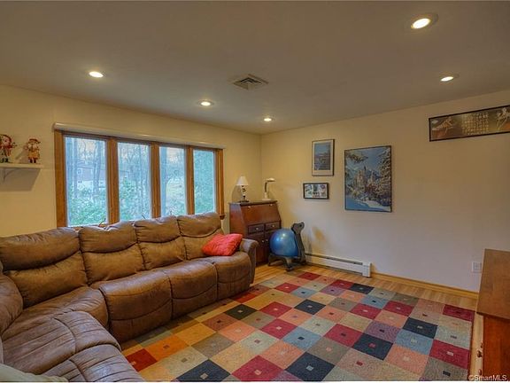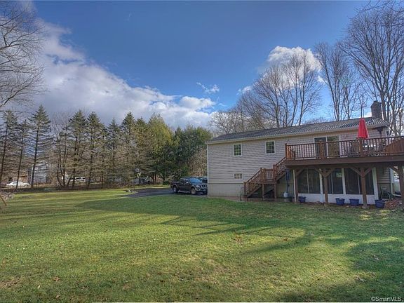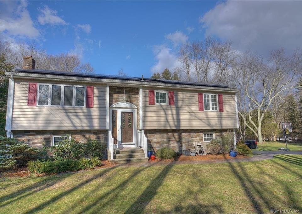 Attractive 3 bedroom home in charming neighborhood! 1,203 square feet with 1.5 baths and active solar for reduced carbon reliance. Kitchen features double sink and modern appliances. Dining room has built-in storage and sliders to Trex composite deck overlooking level back yard. Large closet in main bedroom and full bath. Family room has brick fireplace and built-ins. Central air throughout. Home features a functional mix of carpet, tile, and vinyl floors. Full basement is partially finished and has walkout to three-season sunroom. Attached garage. Close to Naval Submarine Base, Electric Boat, Mohegan Sun and Foxwoods.