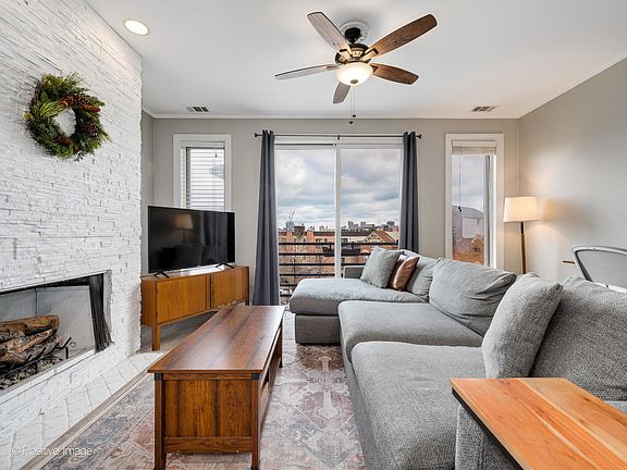 Can't beat this 2 bed 2 bath penthouse with city skyline views in the River West neighborhood! East/West exposure makes for a warm and sunny welcome into the living room with a fireplace, floor-to-ceiling windows and a Juliet balcony. The open floor plan with hardwood floors and a dining area begs for entertaining. Stainless appliances, granite counter tops and modern white cabinets with a subway tile backsplash in the kitchen. The large primary bedroom suite has over-sized windows, a private balcony, a walk-in closet and a spa-like en suite bathroom with stone and marble finishes and dual shower heads. The second bedroom has stone floors and a chic 2nd bathroom with glass shower doors. There's also an in-unit washer/dryer and a garage parking spot included in the price. Steps away from the Blue Line with super easy access to 90/94. Close to Division, East Ukrainian Village, Noble Square, West Town, River North, & Fulton Market/Randolph/West Loop. Unit 2022 Tax/$6,378.17; Parking 2022 Tax/$396.43; Assessments: $247.04 includes Water, Trash, Exterior Maintenance, Snow Removal, Common Insurance, Parking