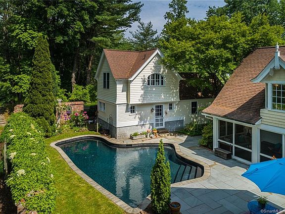 Victorian carriage house situated on 3.44 acres epitomizes privacy in the heart of Southport Village. Complemented by lush, show-stopping gardens, this compound is truly enchanting. Entering through the front door one is delighted by a large scale, paneled living rm with a corner fireplace & French drs that open to a brick walled garden surrounding a sparkling POOL. An office with access to the garden & the dining room w/large framed windows over-look the back terrace & pool. The eat-in kitchen w/colorful Mediterranean-styled tiles connects to the family rm w/built-ins & two sets of original 54" double stable doors. Large 10' x 28' SCREEN PORCH is the perfect place to dine, read & rest after a swim. An ensuite guest bedroom is on the main level as well. Upstairs is a sizable master bedrm w/cathedral ceiling & connects to the 20' x 24' library w/flr-to-ceiling bookshelves & balcony w/views of the property(could be 5th bdrm. Down the hall sits 2 more identical bdrms & full bath. A wonderful LITTLE HOUSE complements the property offering a garden rm, full bath, workshop & 2 studios on the second level, ideal for a work-at-home space or perfect for guests. There is also an oversized GARAGE. Landscaped gardens feature an assortment of flowering shrubs, specimen trees, perennials, bulbs, clematis & ground cover...a gardiner's dream. Walking distance to beach, village center, harbor, library & train station. City SEWER, city water, NATURAL GAS & set off of Pequot Ave