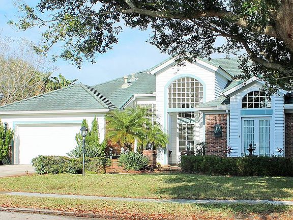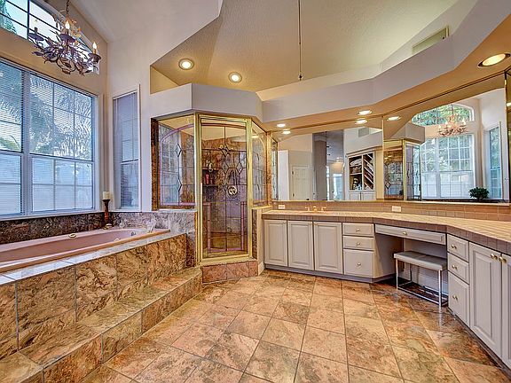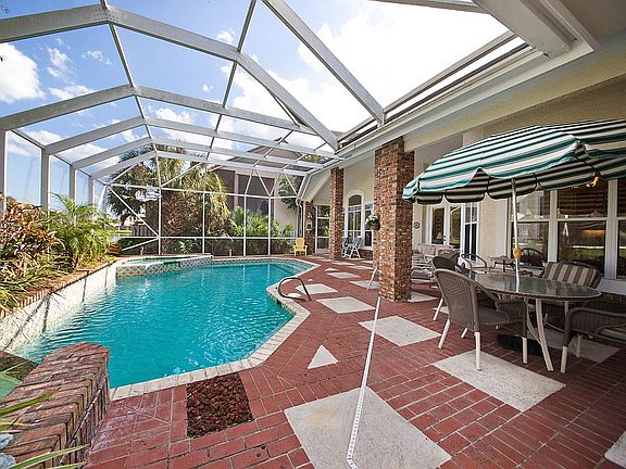 Picturesque Lakefront Beauty, in The Sanctuary! Wake up each day to lake and pool view sunrises, in this 4 bedroom, 3.5 bathroom pool home! From the granite and coral fireplace, oak built-ins, vaulted ceilings, wet bar and pool fountains to the generous formal dining and living rooms, this stylish home is primed for family and entertainment. This home boasts over 2,900 sf of living space, granite kitchen counter tops, wood floors, in ground spa, large master suite complete with pool access, double closets and marble bathroom. The split-bed floor plan features a powder room, 2 bedrooms each with an en suite, one with pool access, a 4th bedroom featuring French doors and front patio fountain views. Enjoy time outside in the fenced yard or on the large covered pool lanai.