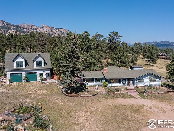 Rare location and incredible views with rock outcroppings and mature trees. Main level living with no stairs, open floor plan and updated kitchen. Easy to add on to plus detached garage has unfinished upper space that could be made into another living space not in the total sq ft.Attached 3 car garage plus detached 2 car garage. One of the nicest locations in Estes, close to everything but totally private setting.
