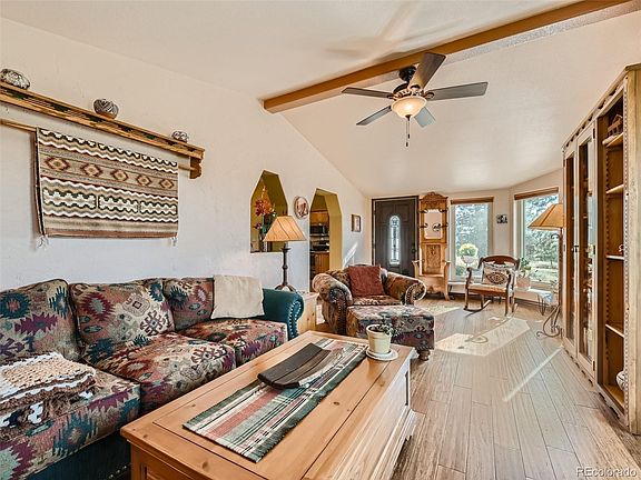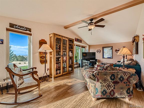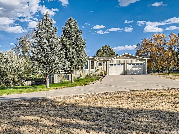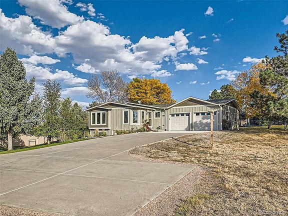 This 3-bedroom, 3 bath home sits high on a beautiful, landscaped hill giving you a full panoramic view of the Colorado Rocky Mountains. Imagine living here where you are free to enjoy 20 well maintained acres without an HOA, zoned Agricultural, with over a hundred pine, spruce, and deciduous trees. The home is well appointed with an updated kitchen including all stainless appliances and roll out cabinets. This is a carpet free home where you will enjoy the benefits of bamboo, tile, and luxury vinyl plank flooring. The main floor provides easy living with primary bedroom, ensuite bath, guest bedroom, private office, plus full bath and main level laundry. As you proceed to the lower level you will appreciate all the natural light a walkout basement offers with sliding doors appointed with Hunter Douglas window treatments. Basement is fully finished including a wet bar, gas stove, bedroom with a ¾ bath, LVP flooring and its own private entrance! This property includes a 30 x 60sf steel building that has heat, concrete floors, half bath, loft, sliding doors tall enough for a motorhome. To top it off it includes a 9 x 9’ spray booth and compressor. In the spacious, manicured backyard, you'll find an elaborate covered dog kennel with two 30x30’ exercise yards. The covered section will accommodate 4- 8’x16’ kennels sitting on concrete flooring. There is also a 10’x10’ garden shed with concrete flooring. Off to one side of the rear covered patio, is a 10’x10’ hobby room perfect for crafts and additional supplies. This house has upscale James Hardie Board siding (installed in 2021), Renewal by Andersen vertical roll out windows, new roof and gutters as well as new steel roofs on the kennel, and shop. PLUS, new garage doors! Just 12 minutes E of Parker located on the private, peaceful, N end of Flintwood Rd. If you’re looking for a close in country living lifestyle blessed with awesome sunrises and sunsets in a natural setting, this home and property is a must see!