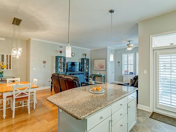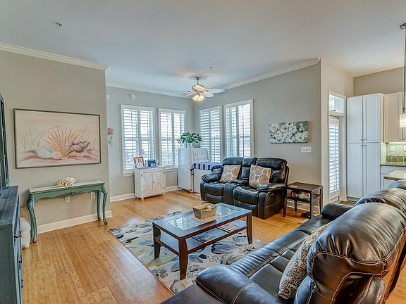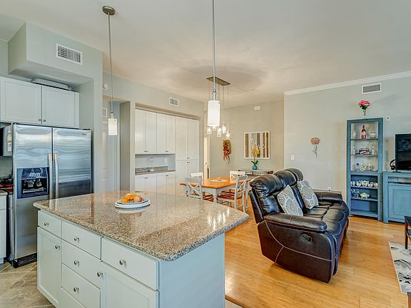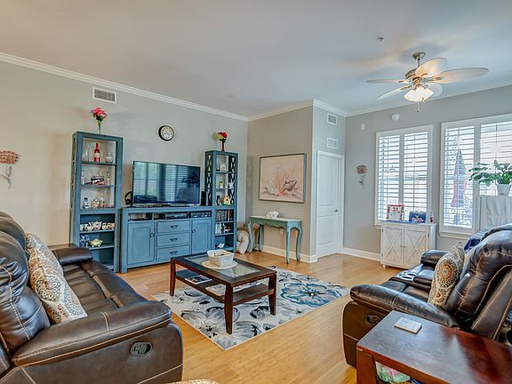 This desirable first floor condo has a cozy corner patio. You can walk right out your door to the pool, amenities building and mailboxes or for a walk. This 3 bedroom unit features 10' ceilings, crown molding in the spacious and open living/dining/kitchen area with kitchen island/breakfast bar, granite countertops and stainless steel appliances. Flooring in living area is bamboo hardwood, tile kitchen and baths and luxurious carpeted bedrooms. Amenities include a one acre resort style lagoon pool with rock waterfall, hot tub, interactive fountain, state-of-the-art fitness facility and indoor basketball/pickleball court. Conveniently located near shopping, restaurants, recreation areas and the beautiful beach. It has beautiful beach style furnishings and are negotiable