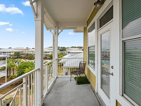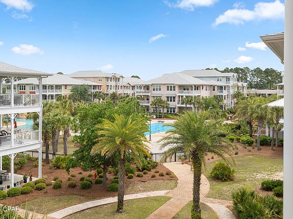Double balconies overlook the beautiful courtyard and lagoon style pool with waterfalls while still being peaceful and serene. Upgrades in 2024 include new paint and carpet, professionally cleaned tile and dryer vents, thermostats and massaging shower head with filter. Stainless steel fridge and dishwasher both new in 2023. Other upgrades include kitchen backsplash, faucet, pull out storage drawer and painted cabinets. Cabinet and vanity hardware upgraded throughout entire condo. Upgraded lighting in kitchen and dining room, new water heater in 2019, retractable screen doors on both balconies and more. Both HVAC units have air scrubbers and UV purifiers, a wonderful addition for allergy sufferers. Step into luxury with 10 foot ceilings, bamboo floors, granite countertops, a walk in shower as well as garden tub and tons of natural light. Resort style grounds include pool, hot tub, clubhouse with fitness center, game room, theater room, indoor basketball and pickleball courts, parking garage, gated community, on site security, regular community social events and more. Located in the heart of PCB, one mile from the pristine white sand beaches. Short term rentals not allowed.