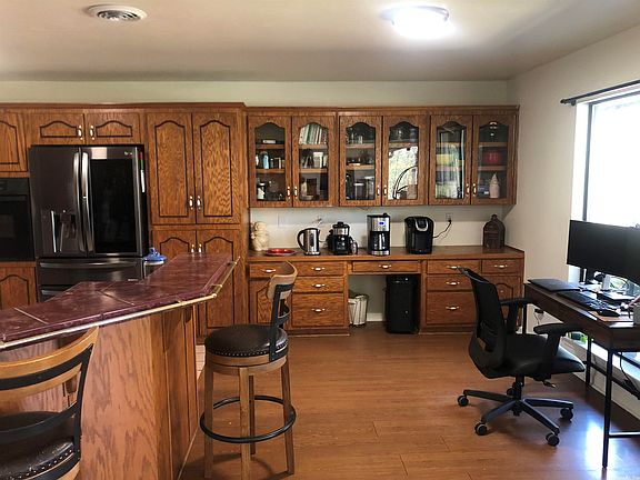 Perfect quiet setting, convenient location to town. Almost 4 acres & pond. Spacious Open living Room accented with Real Wood fireplace & view of beautiful wooded landscape. Kitchen Boasts PLENTY stained cabinets/ Coffee Bar-Work station. Newer Fridges to convey. Master suite features large shower, corner jetted tub w/ view. 2 closets. Laundry area contains craft/hobby counter workspace & storage closet. Updated guests bath. Gazebo w/ fireplace at POND. Come kayak! A once Pool house w/ lots of potential.