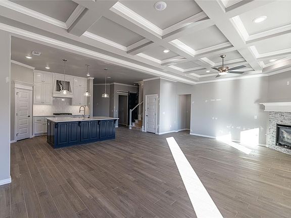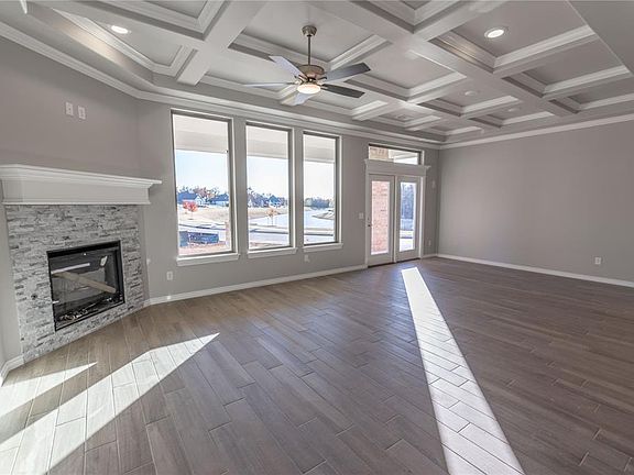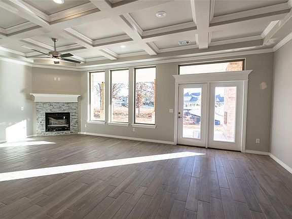 This Mallory Bonus Room floor plan includes 2,955 Sqft of total living space, which features 2,640 Sqft of indoor living space & 315 Sqft of outdoor living space. There is also an EXTENDED three car garage with a storm shelter installed. The 2' garage extension is featured on both the double bay and single bay, ensuring plenty of extra storage space. This magnificent home offers 4 bedrooms, 3 full baths, covered patios, a utility room, & a large bonus room. The great room presents a beautifully detailed coffered ceiling that extends to the dining room, an updated corner gas fireplace with a stacked stone surround detail and an additional window, wood-look tile, elegant crown molding, and a ceiling fan. The outstanding windows featured in the great room are all 7' windows that present the perfect amount of natural light. The kitchen has stainless steel appliances, decorative tile backsplash, 3 CM countertops, a center island with a trash can pull-out, a large corner pantry, pendant lighting, & custom cabinetry to the ceiling. The prime suite features a sloped ceiling detail, a ceiling fan, our cozy carpet detail, & windows. The attached prime bath holds a dual sink vanity, a European style walk-in shower, a Jetta Whirlpool tub, a private water closet, & a walk-in closet. The covered outdoor living holds a wood-burning fireplace, a gas line, & a TV hookup. Other amenities include healthy home technology, a tankless water heater, R-44 insulation, & so much more!