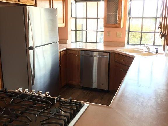 This home has 2 bdrms plus den/study with gas/wood fireplace, vaulted ceiling in living area, all new stainless appliances, gas cooktop, wall oven, dishwasher and refrigerator also included. Separate laundry room, master has walk in closet, garden tub with separate shower in master bath, large deck, hot tub and shed in fenced back yard on a corner lot. possible rv parking on side yard.