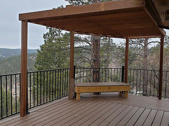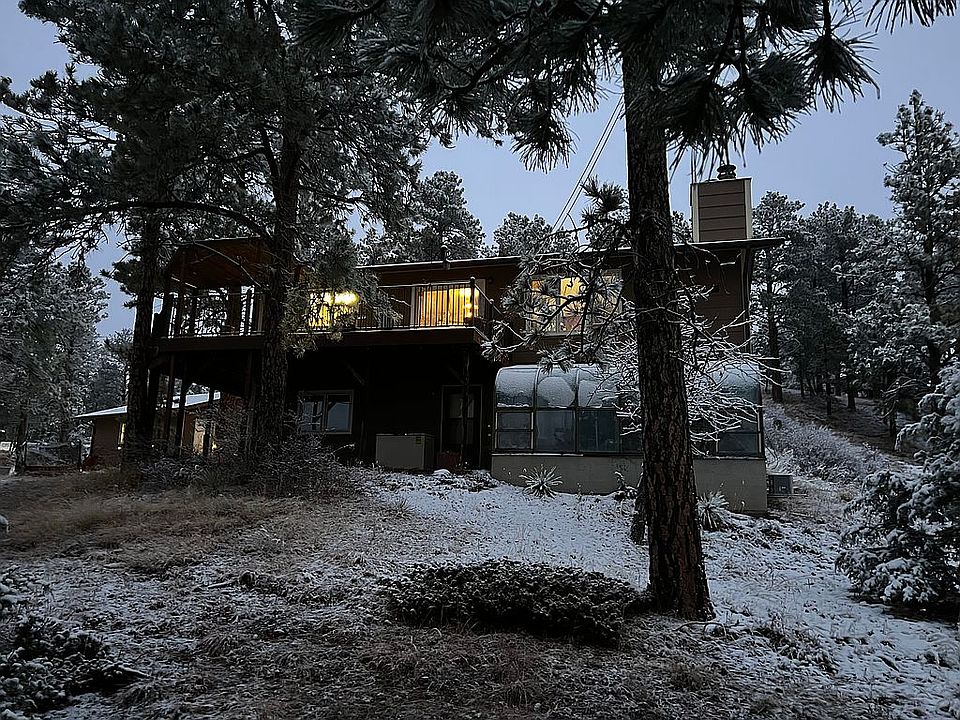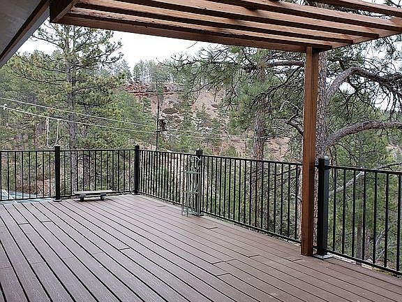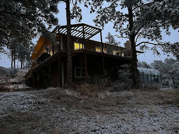 Spectacular views! This is your mountain getaway but not far from town. This four-bedroom home with large deck overlooking Spring Creek Canyon provides you the remote feel and seclusion of your mountain getaway but is minutes from all the amenities of town. Located down a private drive and backing up to a spectacular undeveloped view of the Black Hills, this home takes full advantage of this cliff-side locale. The exterior of this 2-level home, including the expansive deck, has been recently updated with new paint and rebuilt deck in 2022. Updated windows and doors and passive solar design with southern exposure make this an efficient home. The 1300 square foot main floor boasts open concept living, dining and kitchen space, with working fireplace and original tongue-and-groove walls. Primary bedroom with walk-in closet has access to the full bath, and the second main floor bedroom and main floor laundry complete this space. Downstairs, the walkout basement is comprised of a large family room with an efficient wood-burning stove and attached greenhouse, as well as two bedrooms, a ¾ bath, and large area for storage. A two-car detached garage adjoins a large, flat parking area with ample room for RV parking and turn around.