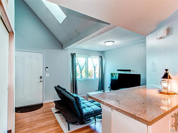 Rare top floor condo, fully updated with low HOA and is FHA and VA loan approved! As you enter, you will instantly take the open feel with vaulted ceilings, sky lights and large windows (newly replaced) and spacious family room with warm wood burning fireplace. The on trend kitchen features granite counters, white shaker style soft close cabinets brushed nickel hardware and tons of cabinet and counter space. The primary bedroom is large enough for a office/desk space and has a private west facing balcony with views and and retractable awing. The primary bathroom has a dual closet space, updated vanity, mirror, lighting and full-size tub with an overhead skylight. Other features of this home include Central A/C. laminate flooring throughout living spaces, newer mechanicals full size washer and dryer combination unit (included), recently replaced electrical panel and dedicated parking space. The location is superb and is just a short walk to a new local park, pizza restaurant, liquor store and local walking/biking trails. This condo has been well loved and cared for, lives much larger than actual sq. footage and shows great!