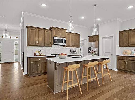 Last chance to own a New Home in Northfield Village! Upon pulling up to this Bradford in Northfield Village of Kansas City Missouri, you are met with charm exuded through the color pallet that was selected. Sherwin Williams Passive on the body(SW7064) paired with their Pure White (SW7705) on the trim and a natural cedar tone used as an accent color, gives a fresh and appealing look. The theme of the inside of this home is bright warmth. The natural light that floods this house compliments the Agreeable Gray (SW7029) walls and provide a feeling of cleanliness and openness. This bright color scheme throughout goes well with the warm colored wood floors and stained cabinets in the kitchen. White countertops and backsplash tile at the kitchen are used, thus furthering the clean slate look. Keeping in touch with the theme of warmth, the tiles selected not only in the bathrooms, but also the stone at the fireplace, have similar hues to that of the wood flooring throughout the main level which add a touch of cohesiveness.