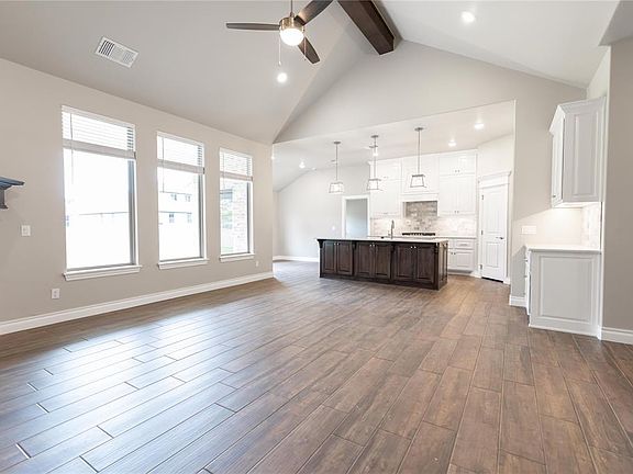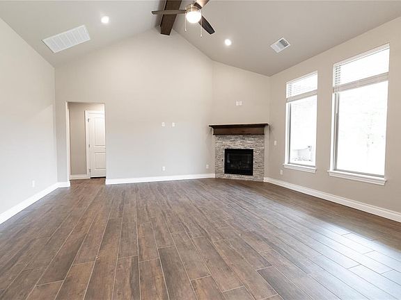 FENCING AND BLINDS INCLUDED! This Hazel Half Bath Plus floor plan includes 2,225 Sq Ft of total living space, which features 2,000 Sq Ft of indoor space and 225 Sq Ft of outdoor living. There is also a 570 Sq Ft, three-car garage featuring a 2' garage extension on the double bay and features an in-ground storm shelter. This home includes 4 bedrooms, 2 full baths, a powder room, covered patios, a mudbench for additional storage, and a utility room. The living area includes a cathedral ceiling with a ceiling fan, a corner fireplace with stacked stone surround detailing, picturesque windows, Cat6 wiring, rocker switches throughout, and wood-look tile as main flooring. The kitchen has a beautifully crafted 3 CM countertop island, a farm sink, stainless steel appliances, decorative tile backsplash, custom-built cabinets to the ceiling, pendant lighting, and a large corner pantry. The primary suite features a sloped ceiling detail with a ceiling fan, more picturesque windows, and our cozy carpet finish featuring Napa carpet padding. The attached primary bath features a dual sink vanity, a European walk-in shower, a free-standing tub, a private water closet, and a massive walk-in closet! Bedroom #2 features wood-look tile, and bedrooms #3 and #4 feature Napa carpet padding for additional comfort. The back patio is covered with an outdoor fireplace, a gas line, a TV hook-up, and a box for a future outdoor fan. Other amenities include our healthy home technology, a whole home air filtration system, a tankless water heater, R-44 insulation, and so much more!