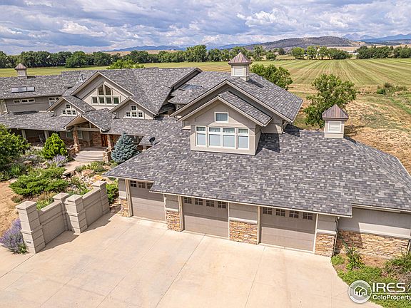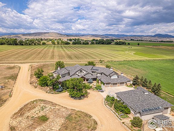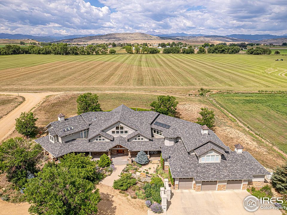 Privacy with amenities is the first thought when looking at this beautiful home outside of Longmont, Colorado. This 7000+/- custom built home sits on 40+/- deeded acres and is being sold with a highly coveted share of Highland Irrigation Water. The views West from the open floor plan show the the majestic Rocky Mountains that boarder the Front Range of Colorado. The home features 4 bedrooms with a full master bedroom each floor. 3 car attached/4 car and wood shop detached garage. Horse Lean too. WOLF Appliances, GEO-Thermal through out, back up Natural Gas Back up Generator.