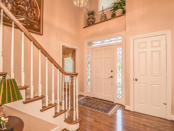 Delightfully elegant home detailed moldings and quality throughout! Updated kitchen and baths, enter 18 foot ceiling two story entry foyer from leaded sidelight and Transom front door onto rich hardwood floors through most first level. Large country kitchen isequipped with cherry cabinets with pull out shelves and cobblestone fireplace in breakfast area, center island, Kitchenaide appliances and Bosch Dishwasher, Family room with walk behind wet bar box beam coiffured ceiling and brick fireplace, (wine refrigerator remains). First floor laundry is loaded with cherry cabinets, folding counter, sink and hang up area. Master suite with sitting area, skylights, updated bath large two head walk-in shower. Other 3 bedrooms are large, all have private bath access one has full bath other two are jack n'jill. Fully finished basement with family room, recreation room, wine closet. Dual high efficient HVAC, security system for lushly landscaped yard. Wood blinds through most home. Three car garage!