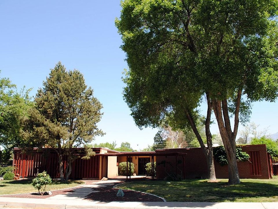 Wonderful La Sala Grande custom one story mid century modern classic! Home centers around a gorgeous brick patio/courtyard, with lots windows & natural light. Patio is perfect for outdoor entertaining. Home boasts brick floors & hardwood under carpet. Open/bright floorplan 4 bedroom plus study, 2 living areas, master with large walkin closet, kitchen with beautiful custom cabinets. Possible side yard access for boat or RV. Quiet neighborhood park close by. Truly a special home in Sandia High
