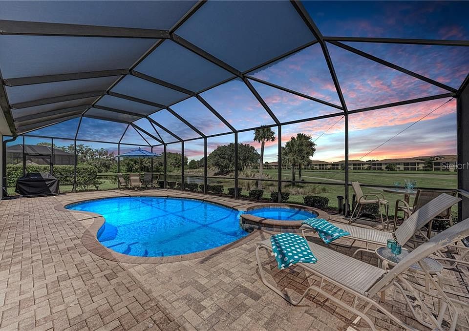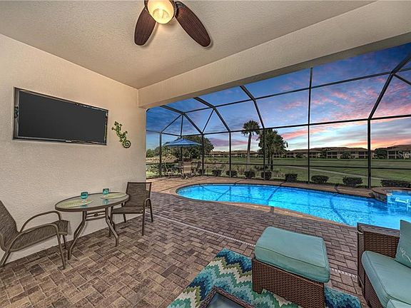 Welcome Home to this light, bright, OPEN Tivoli floor plan which includes a GOLF deeded membership at River Strand Golf & Country Club. Your biggest decision of the day is whether to lounge by the SALT WATER pool on the extended lanai to enjoy the WATER & GOLF views or join in the fun to play golf, tennis or pickleball! Over $65K of UPDATES have been done for you in this lovely home: the MASTER BATH steals the show with the oversized walk-in shower, TILE backsplash in the Kitchen, custom Murphy Bed in guest bedroom/office, updated lighting & fans, fresh paint interior 2019-exterior 2016, upgraded carpet 2019 in all bedrooms & even a new Kitchen single-bowl sink! When you walk in the door, you'll be amazed at how clean this home is! It is obvious the original owners have maintained this home and it was never used as a rental. Some furniture available under separate contract. River Strand Golf & Country Club is a warm and friendly community with a 27-hole Arthur Hills designed golf course, 9 Har-Tru Tennis Courts, 8 Pickleball courts, 2 Resort-Style Pools, 6 Satellite Pools, Clubhouse with restaurant, social events, Community Center & 2 fitness centers in this luxury gated community with 24 hr. security & lawn maintenance . Convenient location to I-75, University Town Center, & beaches complete the package. River Strand Golf & Country Club More than a Community, It's a Lifestyle.
