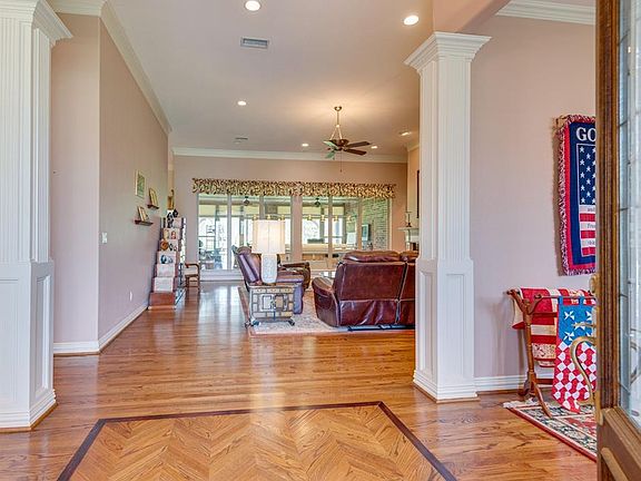 STUNNING BRIAN GAFFIN CUSTOM HOME on large orchard lot in Pecan Plantation golfing community. Outstanding quality & detail in this sprawling, 3359 SF home with 2 oversized double garages, workbench, climate controlled storage & golf cart space! Lots of elbow room here. Open concept home boasts soaring ceilings, beautiful crown molding, warm hardwood floors, split bedrooms and a nice office. Kitchen features beautiful cabinetry, granite counters, island with sink, wine cooler, SS appliances & gas cooktop. Humongous walk-in pantry; abundant storage throughout. Master bedroom has a lovely en suite & 2 large closets. Huge heated & cooled sunroom across back offers views of orchard & wildlife. Quiet neighborhood.
