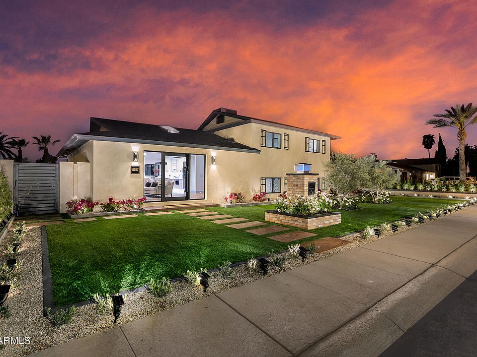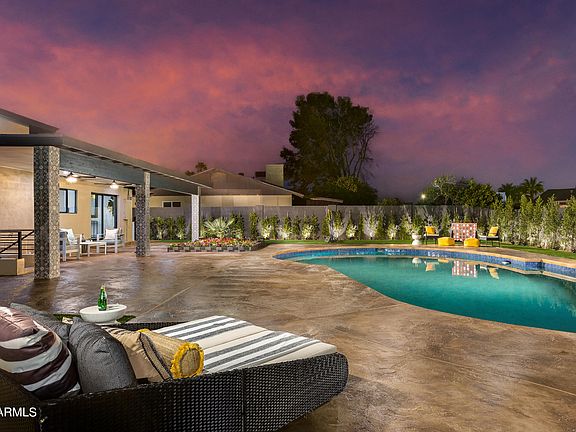 Sliders open to the impeccably manicured backyard. It is a poetic space with an array of ambient lighting, The most beautiful Flower Garden, which molds the beauty of the turquoise pool, outdoor kitchen, BBQ & bar under a pergola custom designed with banquet seating and sprawling lawn perfect to enjoy the quintessential Sunny Scottsdale Lifestyle.