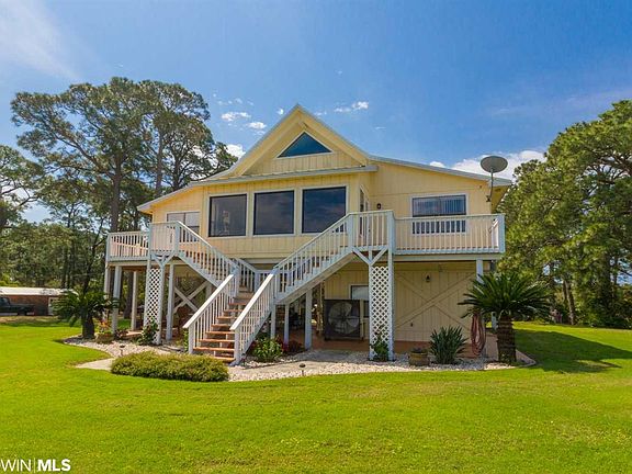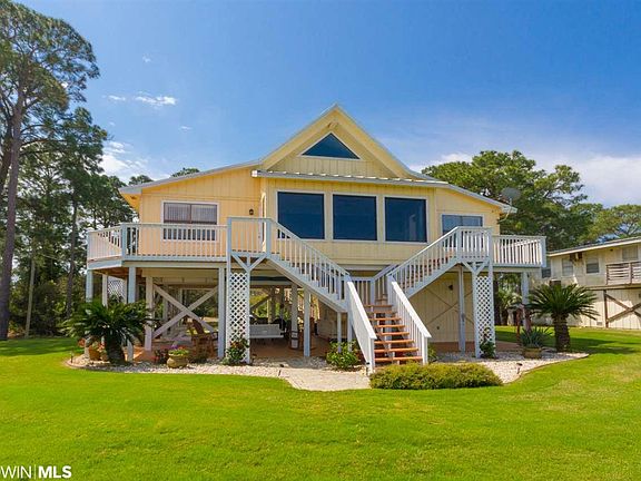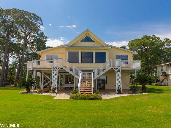 You HAVE TO SEE this gorgeous kitchen remodel! Direct BAY FRONT at it's absolute BEST! Beautiful cottage-style home situated on a rare 100' lot featuring the breathtaking views of Mobile Bay. Concrete seawall and pier, complete with boat lift and fish cleaning table with water. Expansive grass area and cooking/entertainment space under house is perfect for parties and gatherings. For the gardening enthusiast, the landscaping is lush, with 5 Satsuma trees, 2 Lime trees, 3 Naval Orange trees, 1 Ruby Red Grapefruit and 3 Lemon trees. Matching storage building makes for a necessary extra space to store water toys and lawn equipment. Under the home, you'll find room to park two vehicles out of the weather. Inside, the large picture windows perfectly frame the amazing water view. The open concept kitchen and living area, make cooking for and entertaining large crowds easy! The split floor plan provides separation of the guest bedrooms from the master suite, while the laundry is conveniently located adjacent to the master bath. Whether fishing, boating, tending to the fruit trees or enjoying the bay breeze on your face as you read a book on the swing downstairs, there is simply something for everyone to enjoy at this perfect bay front property. Located just west of of the Pine's grocery store, you'll find yourself away from the hustle and bustle, yet close enough to enjoy the best eateries, entertainment and shopping that Gulf Shores, Orange Beach, and Foley have to offer!