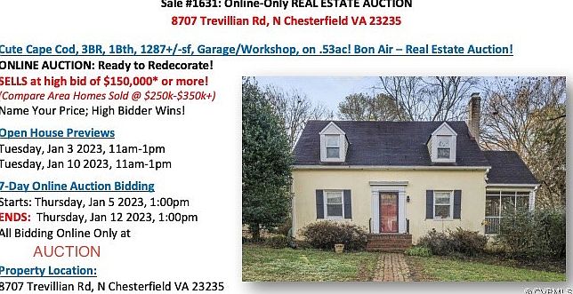 N CHESTERFIELD / BON AIR AREA - ONLINE REAL ESTATE AUCTION! BY ORDER OF SELLER - BIDDING STARTS AT: $150,000 List price is minimum opening bid. High bid at auction determines purchase contract price! This 2-Story Cape Cod Home has 3 Bedrooms, 1 Bath, 1287sf+/- on 0.53ac+/- (per tax record), and includes: First Floor: Living Room w/Fireplace, Dining Room, Eat-In-Kitchen, 1 Bedroom/Office, Screened Porch, & Rear Deck; Second Floor: 2 Bedrooms, 1 Full Hall Bath, plus Detached Garage / Workshop, on 0.53+/- Acre. This Bon Air home is convenient to Rt.60 / Midlothian Tpke, Rt.150 / Chippenham Pkwy, Rt.76 / Powhite Pkwy, and to Downtown Richmond, Midlothian, Riverside Drive and the James River Parks, and is in the James River High School, Robius Middle & Crestwood Elementary School districts. Comparable area homes typically sell in the $250k - $350k+ range. Ready-to-Move-In or Redecorate to suit to your taste & budget. **THIS HOME SELLING BY AUCTION, AS IS** Great opportunity for homeowner, family, or insightful investor. BE HIGH BIDDER & WIN! SALE #1631 (Note: All bidding is online only, no pre-auction offers.). HVAC was replaced in 2013 - Lennox system installed by James River