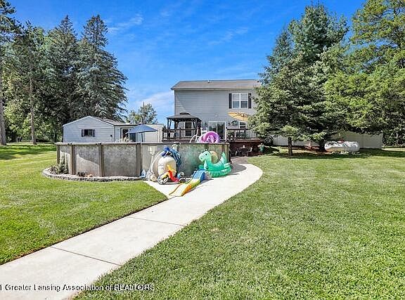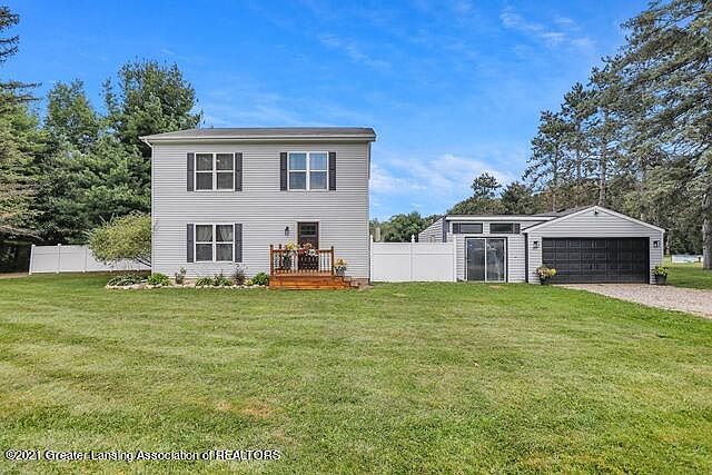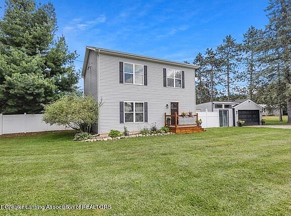Completely remodeled 2 story with 3 bedrooms and 2 1/2 bath with all new flooring, bathrooms, and kitchen, extra large deck on 7.3 acres all while overlooking the Grand River. For the businessman or the person with toys, this has three large barns. Black barn is 30x40 with 12ft tall ceiling and an office with heat and AC. Huge barn 50x80 with 16ft tall ceilings, finished with 400 amp service, hoist (optional to purchase), 1/2 bathroom with hookup for shower and washer/dryer, in floor heat, spray foam insulation, water. Another outbuilding 24x40 with 14ft ceilings, 200 amp service. Beautiful deck off of back of house overlooking the beautiful above ground pool and land with 2 gas line hookups for grill and fireplace. Two driveways, one leading to the garage and another to the backyard out buildings. This home is immaculate and a must see.
