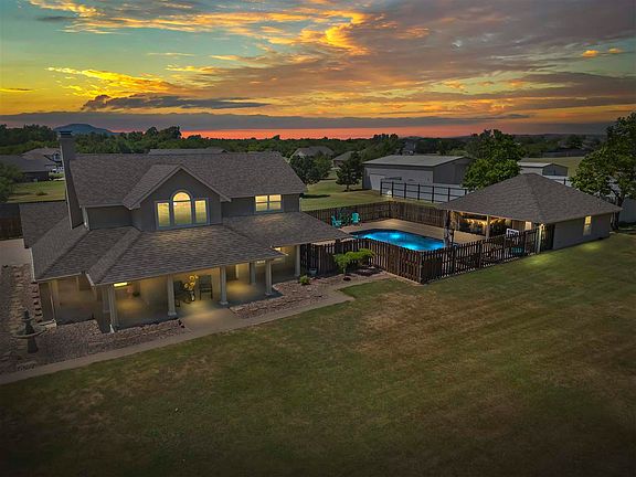 Beautiful home sits on 3.55 acres with an inground pool and pool house! This desirable home is located in Elgin school district and close to Lake Lawtonka. Home is 2 stories with approx. 2400 sq. ft. with 3 bedrooms, 2 1/2 baths and an office. Updates include: remodeled kitchen with new refrigerator and dishwasher, interior paint, downstairs flooring, new hot water heaters, downstairs HVAC unit, and new lighting. Downstairs windows have a professionally installed ceramic coating on them to keep homes temp down. Primary bedroom and office are located downstairs and other 2 rooms upstairs and share a Jack and Jill bath. Primary bedroom is oversized and bath has double sinks, walk-in tiled shower, jacuzzi tub, and his & her closets. Pool has all new coping, new tile, new tanning ledge, and pool was replastered. Pool also has variable speed drive pump and pores for a salt system. Outdoor kitchen has a large bar with granite countertop, sink, and refrigerator. Pool house can be used as a living space or bedroom, a 3/4 bath and new HVAC system. Home has a 220 outlet in garage for an EV car plus a safe room and sprinkler system. Backyard has privacy fence, covered and open patio, and a large covered front porch. Home has been inspected with electrical and plumbing repairs to be completed in the next couple of week. Owner has filed a claim on the roof so awaiting results of that. Give listing agent, Julie Bridges Realtor with RE/MAX Professionals a call at 580-695-3883 with any questions.