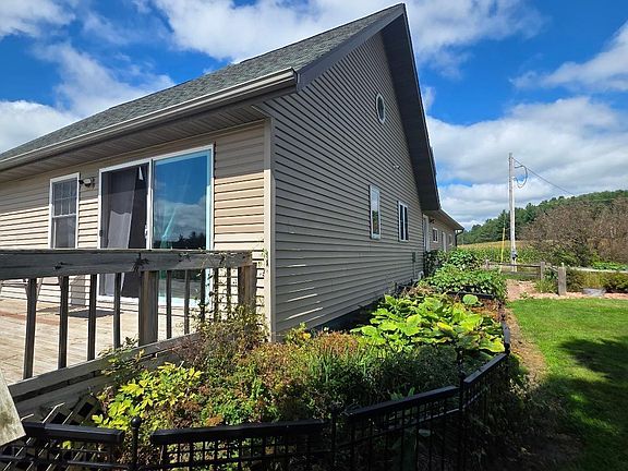 This charming chalet home features four bedrooms and one bathroom, nestled on five acres of picturesque countryside. Unique in design, the residence includes two bedrooms on the main level and two additional bedrooms on the upper level. The open-concept layout encompasses a spacious loft, kitchen, dining area, and living room, creating an inviting atmosphere. Families will appreciate the oversized mudroom, ideal for children. The exterior requires minimal maintenance, while the property boasts a heated and insulated three-car garage. A large deck on the south side offers ample outdoor space, complemented by expansive green areas and a fenced pasture. This home is located in a desirable area with access to an excellent school system.