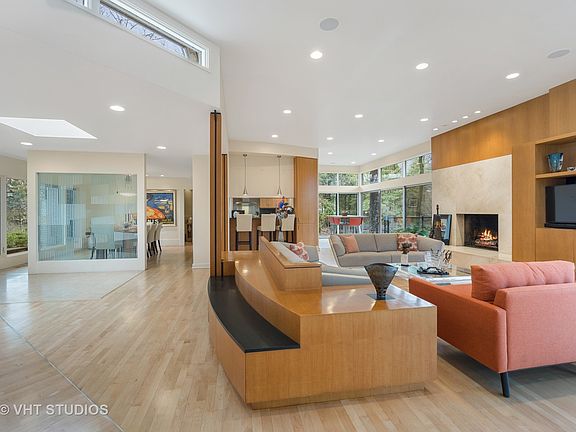 Updated contemporary hillside ranch with open floor plan, set on a gorgeous wooded half acre lot. Stone foyer entry opens to refinished hardwood floors throughout the 1st floor, gorgeous stone fireplace, custom built-ins, and floor to ceiling windows. Enjoy your gourmet kitchen and eat-in area which opens to the new expanded composite deck with stainless rail enclosure giving you a clear view of the multi-level landscape. Additional step-down entertaining space with paver patio deck and fire pit. Chef's kitchen features high-end hardwood cabinets, Sub Zero refrigerator, 6 burner Thermador gas range/oven plus 2 additional Thermador ovens with a warming drawer. Mud room off kitchen can be utilized as laundry room as well. Master bedroom suite includes large walk-in closet, updated bathroom with steam shower, separate soaking tub, heating floors, and beautiful views. Architectually designed staircase leading to lower level which includes a spacious family room with beautiful views, huge multi-purpose room, 2 additional bedroom/ bonus rooms, full bath, laundry room and plenty of storage. Beautifully designed home!