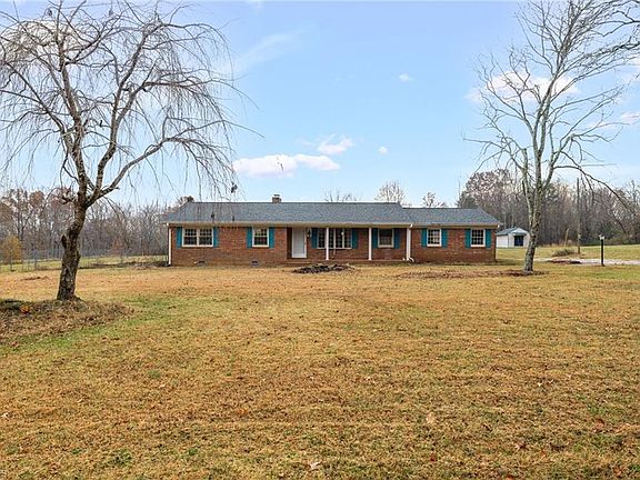 Spacious brick ranch set on a level, nearly 2-acre, open lot! New luxury vinyl plank flooring throughout! Enjoy a brand-new center-island kitchen with stainless appliances, butcher block counters and subway tile backsplash. A new heat pump adds comfort, and the roof is under 10 years old. The kitchen opens to a warm family room featuring a wood-burning fireplace with woodstove insert, for those chilly winter nights, and two skylights. Step down into the bright windowed sunroom overlooking peaceful scenery. A unique stone hall bath with walk-in shower complements the layout. Elegant crown & chair rail moldings and wainscoting throughout the home! The primary bedroom offers an en-suite full bath, plus two additional bedrooms. An unfinished basement provides ample storage. A 2-car garage with laundry hook-ups, along with a covered front porch and concrete patio, complete this inviting home. Country living just minutes from shopping and dining.