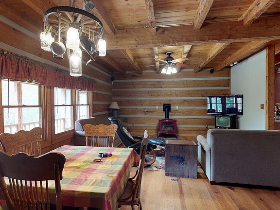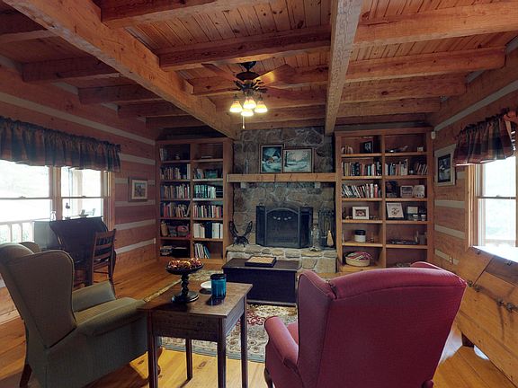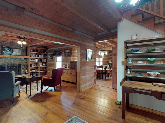 You will feel transported into the mountains when you see this unique log cabin, the guest cabin, and the view. The cabin charm of the wood burning stone fireplace, the hardwood floors and wood beams along with the modern touch of granite counter tops. The Sellers use the bonus as a bedroom. Come enjoy the master suite on the main level, the screened porch and the porch swing. Your guests can enjoy their own cabin and relax and unwind near a beautiful creek. Very peaceful living with blackberry and blueberry bushes, an herb garden, asparagus patch and even figs grown on the property for you to enjoy. Plenty of room to play, garden, or have a small farm. You must see this property to believe the over 11 acres of privacy. Most of the furniture and all of the farm equipment is negotiabl