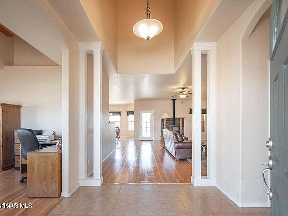 Discover the ideal blend of comfort and rural living in this 3-bedroom plus office, 2.5-bathroom home, nestled in the heart of Chino Valley. This property promotes a seamless single-level living style with 2,174 square feet on 4.06 acres and a private well that produces 24 gallons per minute! The interior is warmly welcoming with a practical layout for that everyday ease. The heart of the home features a great room concept with a kitchen equipped with hard surface countertops and alder cabinetry, and a spacious dining area with room for your hutch flowing into the living area with a cozy pellet stove that adds a touch of rustic charm. The exterior of this residence is just as impressive with its partial wrap-around porch providing stunning 360-degree views. Ample parking is available with its oversized 2 car garage and an additional 20x30 drive-thru detached garage, as well as room for your RV and other toys. The lot is a generous size, enhancing the feeling of privacy and space. On the property you'll find apple, cherry, plum and apricot trees and ready-to-use garden beds, offering a gardener's paradise. Additionally, sustainable living is made easy with multiple chicken coups. The entire property is fenced and gated with an 80x80 interior "backyard" fencing, perfect for your small pets. Residents will appreciate the lack of an HOA, affording more freedom and flexibility in home customization and usage. This home isn't just a place to live, it's a lifestyle waiting to be embraced. Make 871 Seven Bar Trail your new haven today!