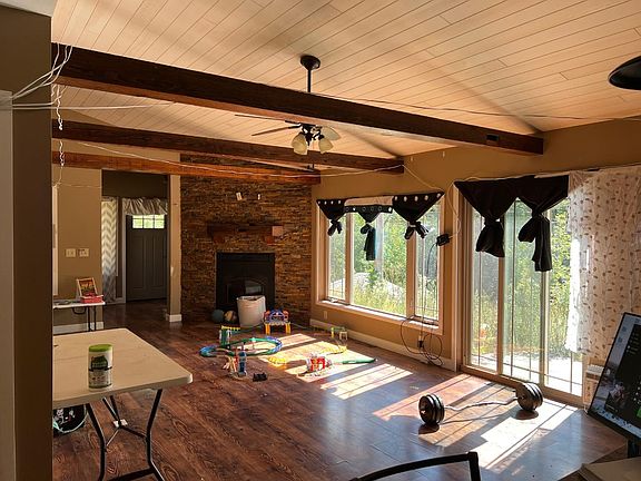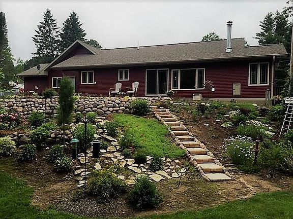 So much potential in this 2 bedroom property that's less than 10 years old! Tucked in on 2.79 wooded acres, 600+' of frontage on the South Branch of the Oconto River, near the Nicolet National Forest and more. A little work will uncover beautiful landscaping including stone and stamped concrete which makes for an amazing view overlooking the water. Open concept kitchen with island leads to living room with vaulted ceilings, wood beams, wood burning fireplace and cozy 4 season room. Large patio with fireplace would be a great location to relax at the end of the day. Spacious 3 stall garage with 2 doors and access to full, unfinished basement that's awaiting finishes! Property is being sold as is.