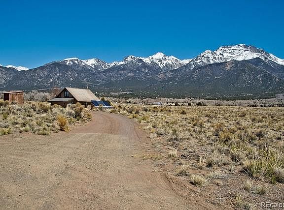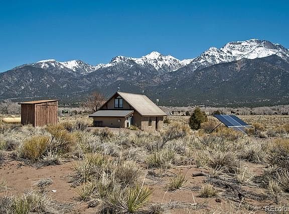 Beautiful petit (784 sq ft) straw bale homestead on Spanish Creek greenbelt! Expertly designed to be the perfect home for a single person or couple, this modest home has everything necessary to live quietly, off grid, and with spectacular views of the Sangre De Cristo Mountains. Situated on 6.9 acres at the end of a cul-de-sac, backing the huge Spanish Creek greenbelt with tons of privacy and quiet. The solar powered, 1 bed, 1 bath home features polished concrete floors, T&G ceilings, built in dining area, deep window nooks for enjoying the peaceful surroundings, and tons of light pouring in throughout the home. Propane runs the heater, on-demand water heater, refrigerator and range/oven. Upstairs, the single bedroom is the centerpiece to the room, with more stunning views of the mountains beyond. Opposite the bedroom a lovely meditation nook allows peaceful viewing of the valley. The utility room includes washer and dryer hookups, and battery bank. This one is a must see for those seeking a simple, quiet Colorado retreat.