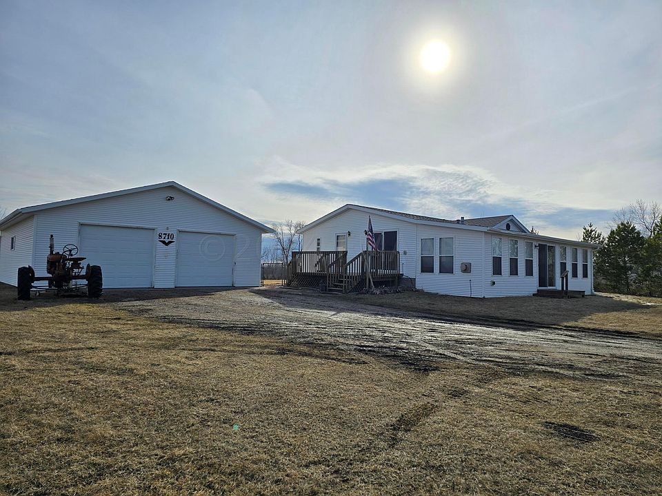 4.1 acres. Diked subdivision.Nice Country Feel, Close to F-M area,**Horses possible! 1996 Dutch manufactured home on 5' deep pillars/block skirt. 3-Season Sunroom 33' x 10' insulated +heater. not included in the home sq. ft. , Large 30'x 36' garage has 8' doors & 9' side walls. Gas propane furnace. House shingles 2007. Jetted tub & shower in master bath.Gas fireplace. Vinyl siding. Fenced area behind the house. appliances included.Storage Shed