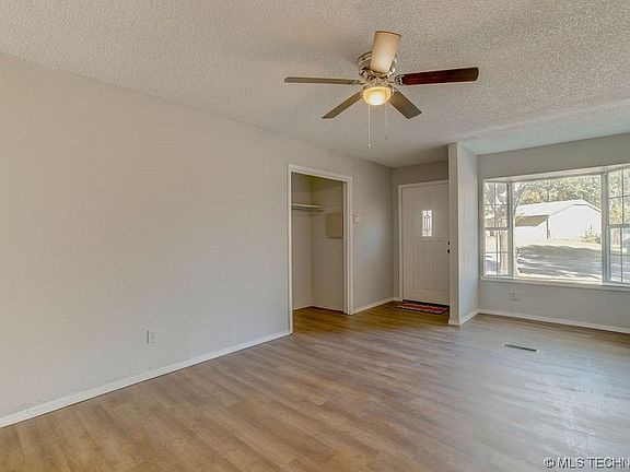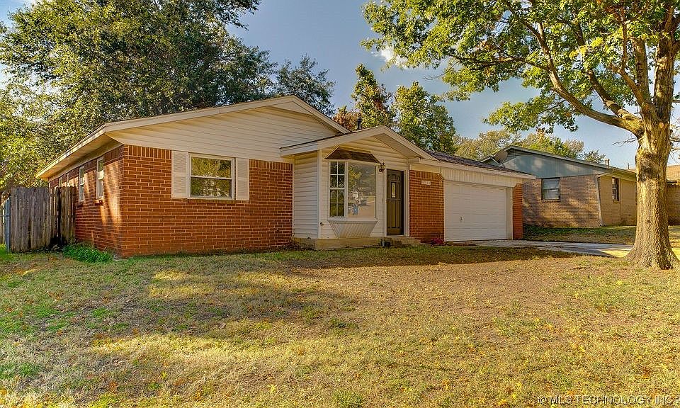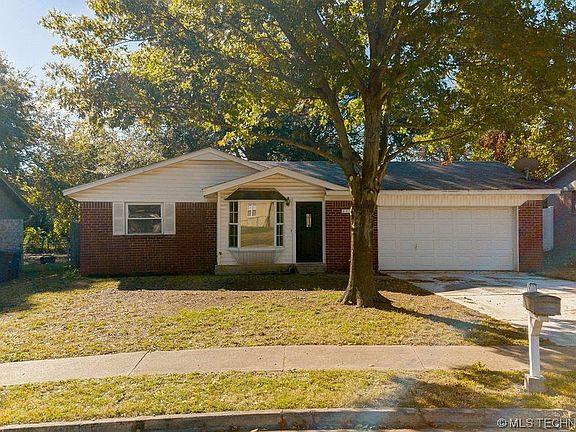 Super cute, ranch style 3 bedroom, 1 1/2 bath home with lots of new updates that is very close to Tulsa amenities/shopping, highway access, but also in a quiet, peaceful neighborhood! Large living room with beautiful bay window. Wonderful kitchen with tons of cabinet space, an area for breakfast nook plus kitchen includes appliances - refrigerator, stove, & dishwasher! Master bedroom has private bathroom. Extra Large 3rd bedroom could easily include an office with separate access to backyard. There is also a large enclosed patio/sunroom with large window views of the big backyard that has so much potential, with mature trees & full privacy fence! Recent updates include fresh paint, flooring, new bathroom/plumbing fixtures, light fixtures, new AC/furnace. Split floorplan. Tons of closet space. 3rd bedroom and sunroom not included not in tax record sq ft. Garage area could be converted or use to store all your mower, tools, etc! Perfect starter home or investment - Won't last long!