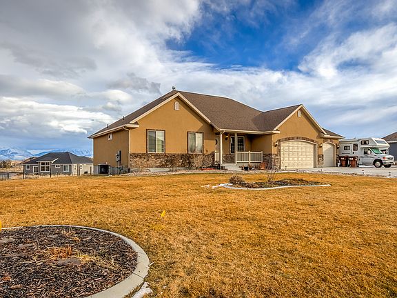 Beautiful rambler with 5 bedrooms plus den and 3 full baths on large .55 acre lot in young Eagle Mountain neighborhood. Nice open floor plan with wood flooring and vaulted ceilings in living room. Master with vaulted ceiling, garden tub and shower. Kitchen has stainless steel appliances, granite countertops, tile flooring. Large fully finished basement with 2 bedrooms, large family room, full bathroom, wet bar and more. Whole home humidifier and water softener. Front yard landscaped with automatic sprinklers, large driveway and RV pad.