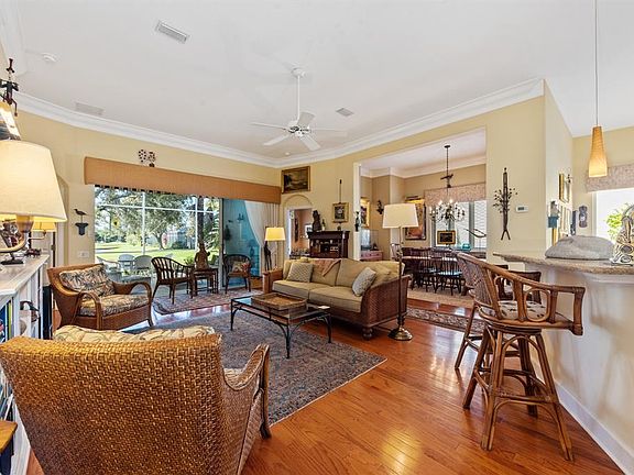 Picture yourself living with a beautiful water and golf course view in the gated community of Rosedale Golf and Country Club. This home is truly made for both entertaining and everyday living, with plenty of space and fabulous views. Enjoy an open floor plan, high ceilings, and an updated kitchen with granite counters, plenty of cabinets, a roomy pantry, plus a breakfast nook with sliding doors to a private pavered courtyard. This home has been meticulously maintained and beautifully appointed with hardwood floors, crown moldings, and built in bookcases. The open and airy plan offers lovely views from every window. The great room is open to the dining room, kitchen, and tranquil lanai. A spacious master suite features a large closet and wonderful ensuite bathroom with dual sinks, vanity space, a soaking tub and walk in shower. A second bedroom and a home office/den complete the picture of this desirable home. More recent updates include new roof (2019), new A/C system (2019), and new gas hot water heater (2019). Enjoy a carefree lifestyle in this low maintenance community in a perfect location near excellent restaurants, all the shopping you could ever want, I-75 for an easy commute, and both the downtown areas of Sarasota and Bradenton, plus our incredible beaches. Optional memberships are available to the Country Club featuring golf, tennis, pool, fitness center, and full service clubhouse. This property is immaculate, well-cared for, and ready for new owners. Welcome home!