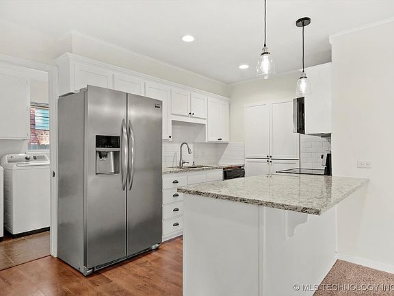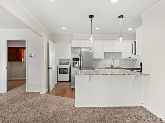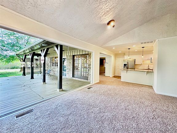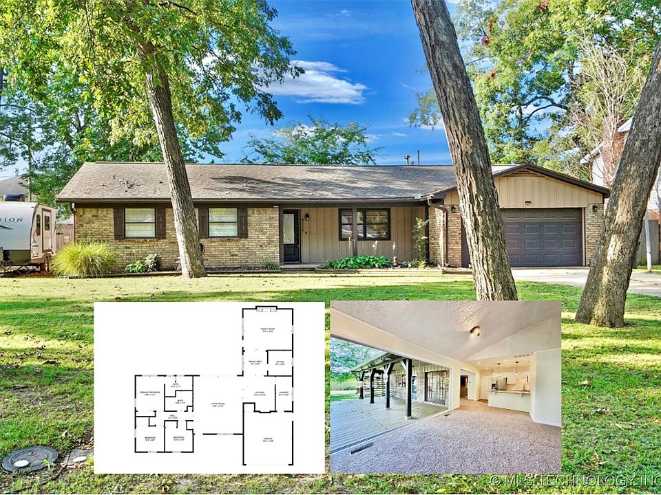 Welcome home to this charming full brick, single-story Ranch-style home is on almost a half-acre lot. You'll love the front porch and back patio, and it's on an end street with walking trails right there! Plus it's very close proximity to shopping and some great restaurants, one restaurant at the other end of the street! Highlights include a newer roof, brand-new carpeting throughout, and fresh interior paint throughout much of the home. The kitchen has beautiful granite countertops and stainless steel appliances, with the added bonus of a refrigerator that stays! Step out onto the large and amazing deck off the patio, perfect for relaxation and entertaining. Enjoy large stunning floor-to-ceiling windows in the front living room, which invite abundant natural light and seamlessly blend indoor and outdoor spaces. You absolutely have to see this to enjoy it! The cozy den features a fireplace and built-in bookshelves, while an office or flex room adjacent to the kitchen offers versatility for your needs. The master bath is updated and beautiful. Plus, this home is situated within the highly regarded Bixby North School District.