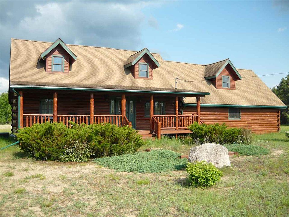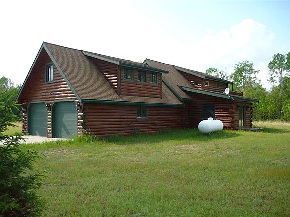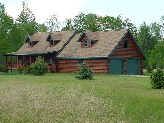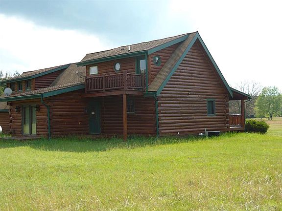 Very attractive log cabin in the middle of 16 peaceful acres. The only home in sight is this beauty, with genuine full log construction and exceptional Jim Peterson/Woodsong finish work. Combined with quality materials and modern systems, this is an outstanding get-away or year round home. Full length covered porch welcomes visitors, grill/entertain there or sit and take in the surrounding sights. Step in to large living room with soaring tongue & groove ceiling, full log beams, gas fireplace and impressive open staircase. Adjacent, modern kitchen with travertine tile flooring, stainless appliances, beautiful light oak cabinetry and pantry storage with roll-outs. Separate cozy dining room with vaulted ceiling, beams, windows, and passage door to back yard, or slider to open deck. Main floor bedroom and full bath with jetted tub. Inviting master suite loft with pretty pine flooring, beams, tongue & grove wall treatment, and private bath with travertine tile shower. Private, elevated sunrise deck overlooks open area and your wooded property beyond. Stair-top landing overlooks living room and fireplace. Lots of extras; full basement houses mechanical components, furnace (central A/C) central vacuum, washer,dryer & utility sink. Basement is well insulated and could easily be finished to provide family or rec room. Extra deep attached garage has plenty of additional space for storage and workshop. The entire loft above garage is outfitted with dormers, windows, electrical, central vacuum and only awaits your design and finishing ideas.