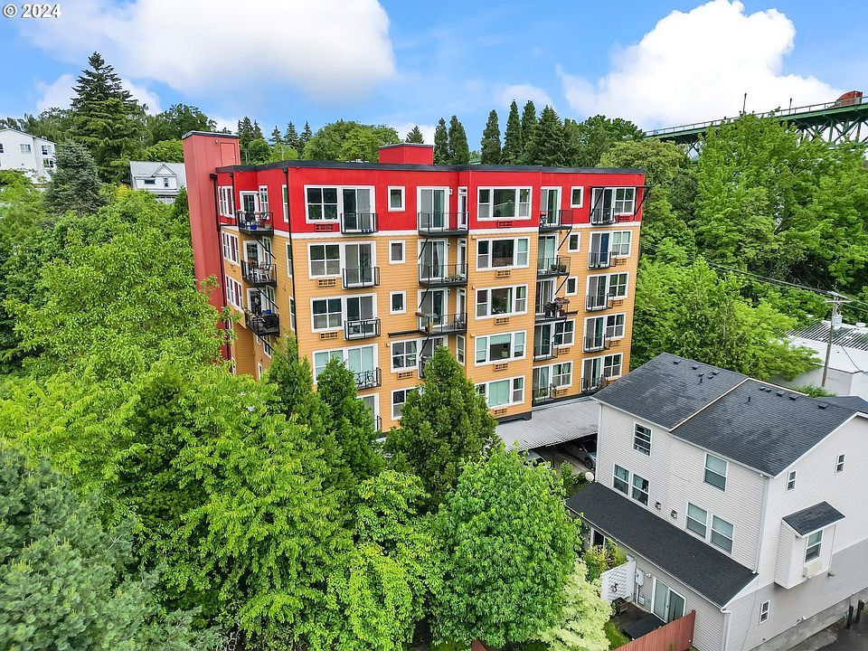 Rare opportunity to enjoy 180 degree view of the Willamette River, St. John's Bridge, and Forest Park from this 4th floor corner contemporary condo just 1 block to Cathedral Park and 6 blocks to the heart of St. John's village vibe. 2 Balconies allow for outdoor living and catching the river breeze. Serene open floor plan with views that expand the space as far as the eye can see. Quality updates. Wool carpet, custom closet organizers, double pane windows, granite counter tops, tile floors in bath and thoughtful lighting package. Super convenient with secured garage parking spot with elevator service and 2 storage units.