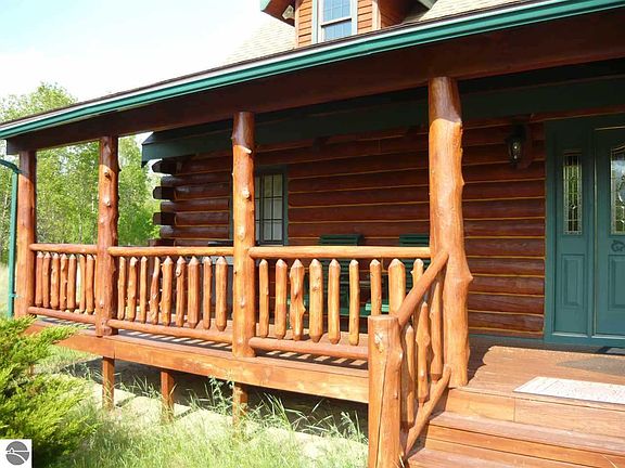 Very attractive log cabin in the middle of 16 peaceful acres. The only home in sight is this beauty, with genuine full log construction and exceptional Jim Peterson/Woodsong finish work. Combined with quality materials and modern systems, this is an outstanding get-away or year round home. Full length covered porch welcomes visitors, grill/entertain there or sit and take in the surrounding sights. Step in to large living room with soaring tongue & groove ceiling, full log beams, gas fireplace and impressive open staircase. Adjacent, modern kitchen with travertine tile flooring, stainless appliances, beautiful light oak cabinetry and pantry storage with roll-outs. Separate cozy dining room with vaulted ceiling, beams, windows, and passage door to back yard, or slider to open deck. Main floor bedroom and full bath with jetted tub. Inviting master suite loft with pretty pine flooring, beams, tongue & grove wall treatment, and private bath with travertine tile shower. Private, elevated sunrise deck overlooks open area and your wooded property beyond. Stair-top landing overlooks living room and fireplace. Lots of extras; full basement houses mechanical components, furnace (central A/C) central vacuum, washer,dryer & utility sink. Basement is well insulated and could easily be finished to provide family or rec room. Extra deep attached garage has plenty of additional space for storage and workshop. The entire loft above garage is outfitted with dormers, windows, electrical, central vacuum and only awaits your design and finishing ideas.