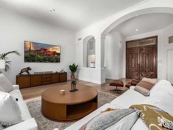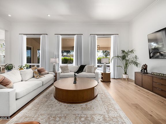 Nestled in a tranquil cul-de-sac, just steps from a serene park, this exquisitely remodeled residence epitomizes refined elegance. Boasting 3 bedrooms, 2.5 bathrooms, and a versatile den/office adorned with custom built-ins, this home offers both luxury and functionality. The opulent primary suite, along with a generous guest suite, features bathrooms embellished with marble accents. The gourmet kitchen is a culinary masterpiece, showcasing quartzite countertops, an expansive island, and top-tier commercial appliances. The breakfast nook seamlessly transitions to a south-facing backyard haven, complete with a putting green, cascading waterfall, mature trees, and sophisticated brass landscape lighting—crafting your personal secret garden. Recent enhancements include the addition of $25k worth of premium custom window treatments and curtains, pristine white oak plank flooring, fresh interior paint, comprehensive lighting upgrades, and an advanced alarm system equipped with automatic water shut-off. This gem, located in the coveted Cactus Corridor, is not to be missed!