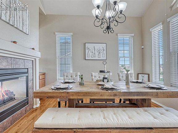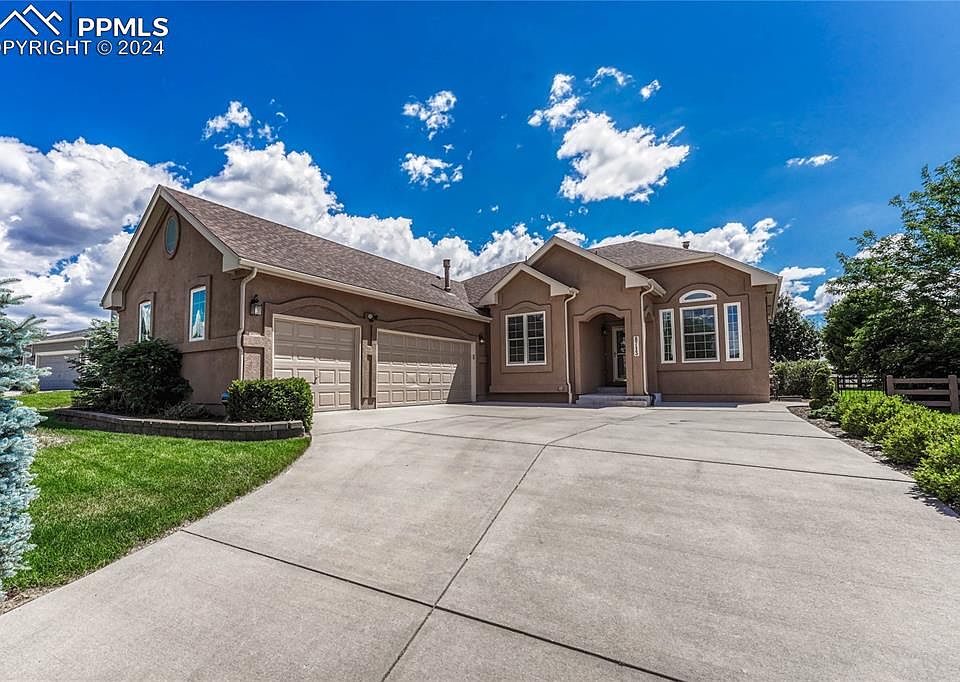 Welcome Home! Nestled in the distinguished Wolf Ranch community and backing to a serene grazing pasture, this stunning 2004 stucco ranch-style home offers four bedrooms, four bathrooms, and numerous upgrades both inside and out. Set on an expansive 14,559 sq ft lot, this home features a three-car garage and an oversized driveway. The exterior boasts fresh paint, new sod, a covered front porch, a fully fenced backyard, a custom storage shed, and a fire pit. Inside, you'll appreciate new Andersen windows, custom window treatments, main-level oak hardwood flooring, 42” hickory kitchen cabinetry, and new stainless steel kitchen appliances. The primary suite is a luxurious retreat with French doors leading into the 5-piece en suite bathroom, heated porcelain tile, and a cedar-lined walk-in closet. There is also a formal office that could easily be converted into a fifth bedroom (and become a third bedroom on the main level). You will also value the home’s air conditioning, humidifier, main-level laundry room with utility sink and cabinetry, formal dining room with a double-sided fireplace, eat-in kitchen featuring a pantry, and upgraded wrought-iron stair railings. The fully finished basement is an entertainer's dream, complete with an expansive wet bar, the ability to complete a true home theater, a second gas fireplace, two oversized bedrooms both with expansive walk-in closets, heated porcelain tile floors in the secondary bathroom, and ample storage/closet space. Steps away from numerous community amenities (such as the pool, splash park, clubhouse, dog park, parks, trails, Wolf Ranch Concert Series, Wolf Ranch Day at Rocky Mountain Vibes Baseball, Fall Festival, Santa at the Ranch, monthly family nights, community parties, PowerArt, etc…), and just minutes away from our military installations, award winning schools, shopping, dining, entertainment, I-25, Powers, and the like, this home will not last and is not to be missed, so schedule your showing today!