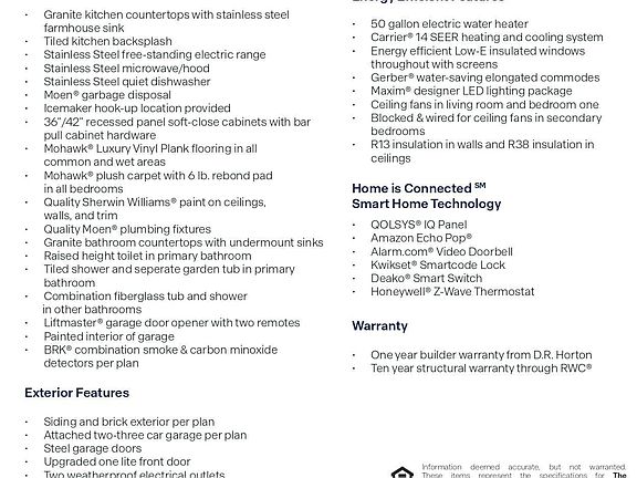 Exterior features include Low-E insulated windows with screens, a High Efficiency Carrier 14 SEER heating and cooling system. The roof and sides are covered in ZIP sheathing which is preferred in areas prone to high winds and wind driven rain.