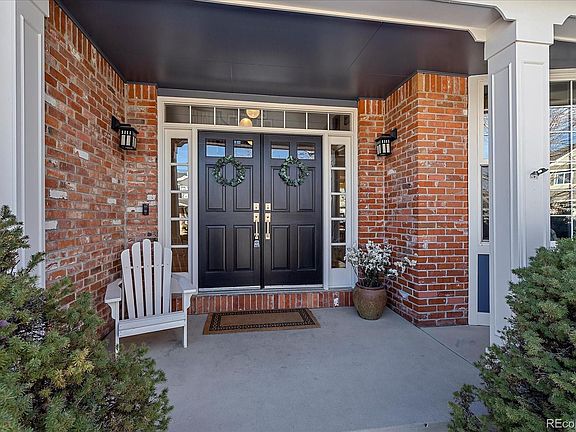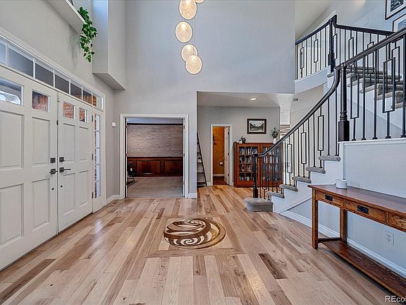 Welcome home to this beautiful, well-maintained home in the Hidden Pointe neighborhood in Castle Pines North! Location is unbeatable - quiet cul-de-sac and a large 13k sq ft private lot that is adjacent to open space. Main floor features 5" hickory plank REAL hardwood flooring and foyer has custom wood-inlay design. New high-end hand-blown glass pendant in foyer. Staircase has new wrought-iron balusters, lighting and carpet. The lovely open-floor concept kitchen was remodeled in 2020 with quartz countertops in kitchen and new GE Profile induction stove on island which is so efficient to cook with and a breeze to clean up. Kitchen is open to large family room with wood beam ceilings, plantation shutters throughout. Main floor also has dining room, living room, and office with french doors, custom built-ins, wainscoting and 3/4 bath. Large backyard has plenty of space for the kids to play and features an incredible stamped concrete patio, perfect for barbecuing on those warm summer evenings. Four bedrooms are upstairs including large primary suite with 5-piece bath and walk-in closet. Bedroom #2 and #3 share a Jack-and-Jill bath and bedroom #4 has its own ensuite bath. Head downstairs to the fully finished basement which has an art/craft room, 3/4 bath, TV and game area, bar, and exercise room. Exercise room could easily be converted to 5th bedroom if needed! Don't forget to check out the abundance or storage rooms just next to gym (also extra storage crawl space within), and art/craft room. There is even a cute kid's play area under the stairs!