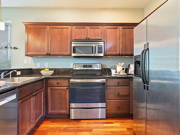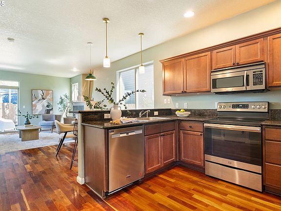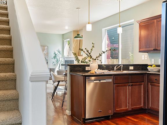 Beautiful contemporary craftsman in the heart of vibrant Kenton. Nestled on a quiet cul-de-sac just blocks from downtown Kenton and Kenton Park, this stunning 3-bedroom, 2.5-bath home blends a modern floor plan with the benefits of newer construction in an unbeatable location. Step inside from the covered porch to a light-filled, open-concept living space featuring soaring ceilings and rich Brazilian hardwood floors. The entertainer’s kitchen boasts cherry cabinetry, stainless steel appliances, granite countertops, and bar seating—a perfect hub for gatherings. Enjoy seamless indoor-outdoor living in a lush, sun-drenched yard designed for beauty and low maintenance. Host summer evenings on the bluestone paver patio beneath cozy string lights. Upstairs, retreat to the luxurious primary suite offering views of Mt. Adams, vaulted ceilings, a spacious bedroom, and an en-suite bath with granite counters. Two additional well-appointed bedrooms, a full bathroom, and a convenient laundry room complete the second floor. Quality updates include newer AC, exterior paint, and refreshed kitchen lighting. A+ location, just a short stroll to Kenton’s beloved spots like Posies Cafe, Fino Pizzeria, the library, MAX Yellow Line, and quick access to I-5 and Adidas. [Home Energy Score = 6. HES Report at https://rpt.greenbuildingregistry.com/hes/OR10239707]