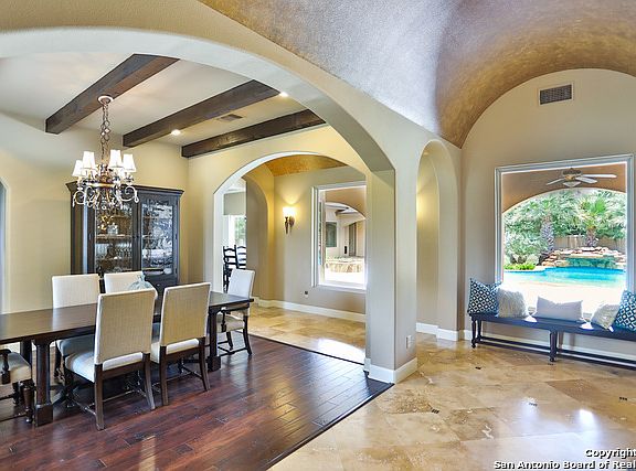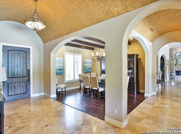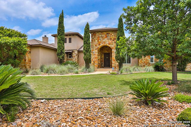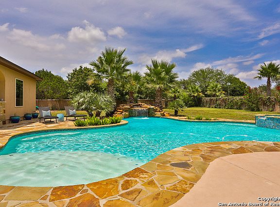 Resort Living in highly sought-after Deer Meadow Estates of Fair Oaks Ranch. Numerous large picture windows throughout this one-story home let in natural light and draw you to a view from almost every room of the gorgeous pool and hot tub, covered patios, and custom stone firepit w/ built-in seating. Large open floor plan great-room has high ceilings, custom light fixtures, stone fireplace, circular kitchen eating area surrounded with windows, built-in wet bar and a full bathroom. The gourmet, classically designed, kitchen with modern touches boasts a large island, enormous eye-catching stone arch, walk-in pantry, and built-in family control and drop zones. The master bedroom retreat includes private access to the backyard, an enormous spa bathroom with separate vanities, walk-in shower with dual shower heads, garden tub, and a large walk-in closet. Large office with glass french doors and closets could be 5th bedroom. The opposite wing of the home consists of custom desk built-ins/study area, 3 bedrooms each attached to a bath, additional half bath, family game room including custom bar with sink and fridge, and a fantastic theater room with stadium seating! 3-car garage, exemplary Boerne ISD, school bus stop steps away. Whether you love to entertain or want a private family oasis, look no further - you've found your new home!!