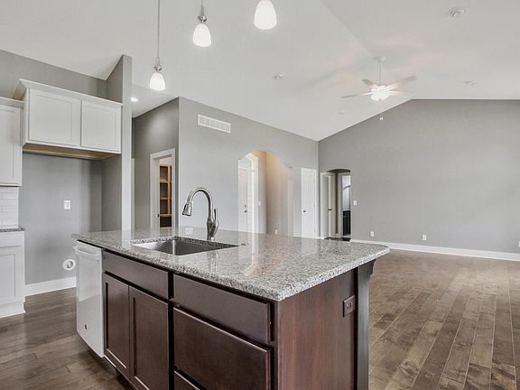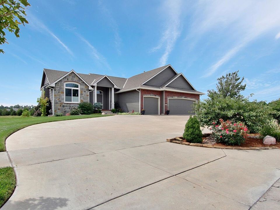 This fabulous split bedroom home sits ever so nicely on a corner lake lot in the Maize School District! When you arrive the first thing you will notice is the unique circle concrete drive with additional concrete on the side of the home. The landscaping is done so very well that you could win awards! The home has beautiful curb appeal and awesome front elevation with brick and stone. Entering the home you will find gorgeous engineered wood flooring and large windows for tons of natural lighting. This design is a split bedroom plan with 3 bedrooms on the main floor. Just off of the large living room is the chef's kitchen with cook top, double ovens, custom built-in hood, beautiful granite counter tops, island, engineered wood flooring, large kitchen sink and tons cabinets. The master bedroom offers a large bedroom with an additional sitting area that has a gorgeous view of the pond and a deck to the screened in deck. You will find spa like features in the master bathroom with double vanities and onyx shower. The basement is a mid-level walk-out basement with view-out windows. Entertain in the finished family room and game room in the basement or relax on the covered screened in deck overlooking the pond. Some information is estimated and cannot be guaranteed. Buyer to verify schools.